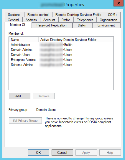 รูปข้างล่างแสดง tab Member Of ซึ่งจะบอกได้ว่าอยู่ในกรุ๊ปไหนบ้าง